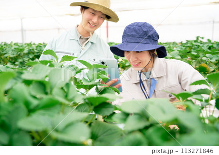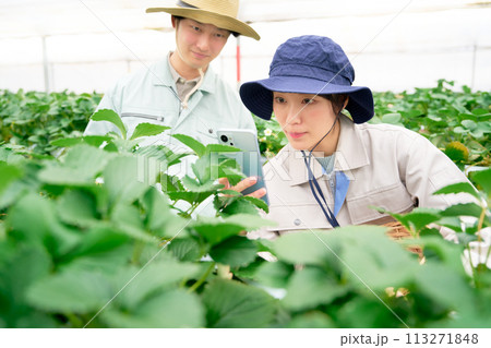 ビニールハウスにて農作物にスマホを向ける作業服の男女