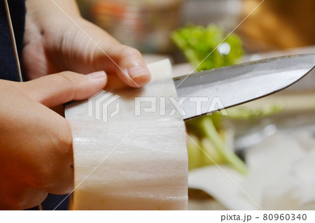 包丁で大根の桂むきをする