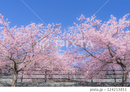 青空と21世紀の森公園に咲く河津桜 福島県いわき市