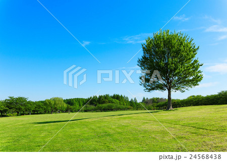 みさと公園の草原の大きなトウカエデの木の若葉と新緑