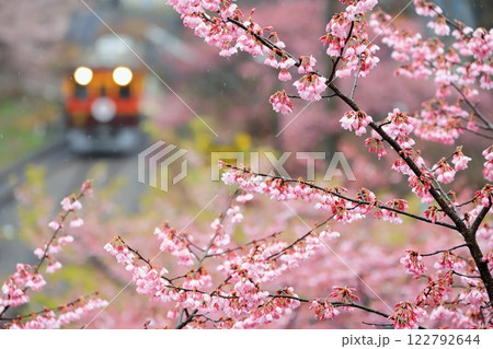 わたらせ渓谷鐵道「春雨の中の桜と列車を背景に」