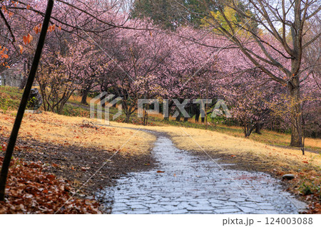 雨衣の冬桜 雨に咲く冬桜 開花した冬桜