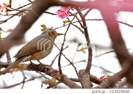 美しいソメイヨシノの間を飛び回って花の蜜を吸う美しいヒヨドリ(ヒヨドリ科)東京都文京区-2024年