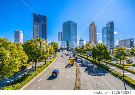 日本の横浜都市景観 6月。桜木町駅前から横浜桜木町ワシントンホテルや横浜市役所、富士ソフトなどを望む