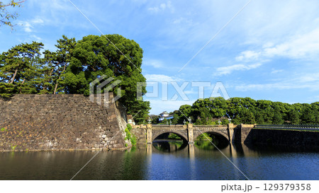 皇居 桜田濠の緑と背景の都市風景