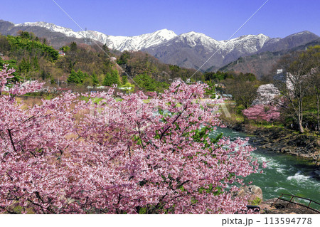 桜咲く諏訪峡園地から谷川連峰の眺め