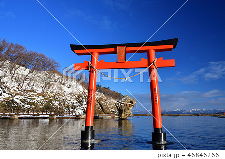 正月の準備が整った北海道江差町瓶子岩と朱色の鳥居の冬の風景を撮影