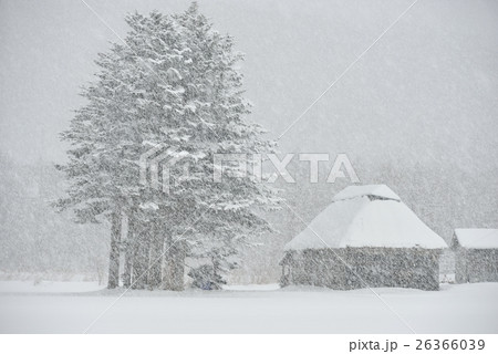 大雪のかやぶき屋根の物置小屋と木立の冬景色