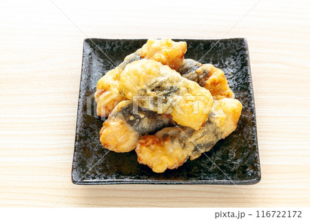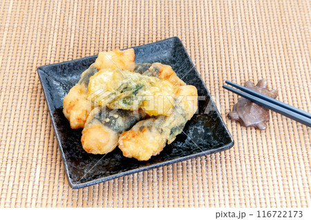 皿に盛った梅シソ巻き鶏の唐揚げ
