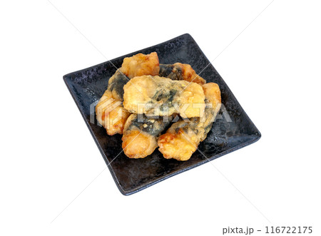皿に盛った梅シソ巻き鶏の唐揚げ【白背景・切り抜き】