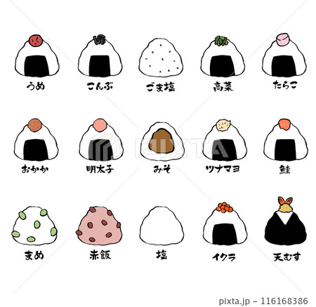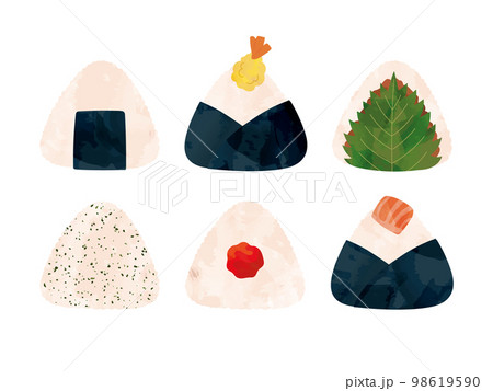 いろんな味のおむすびのイラスト_うめ 鮭 海老天