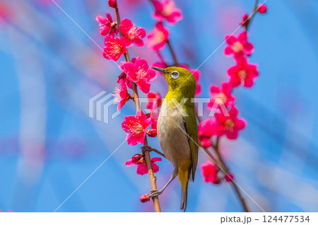 爽やかな春の空 満開の梅の花とかわいいメジロ