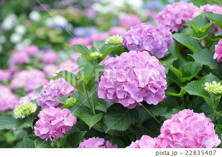 郊外のアジサイ寺に華やかな紫陽花の花ー拾