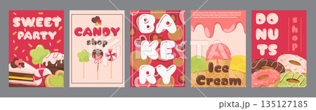 Candy shop typography template posters. Vertical covers with icing cookies, lollipops, sugar cakes, delicious desserts for sweet party. Modern banners set in minimalism design. Vector illustration.