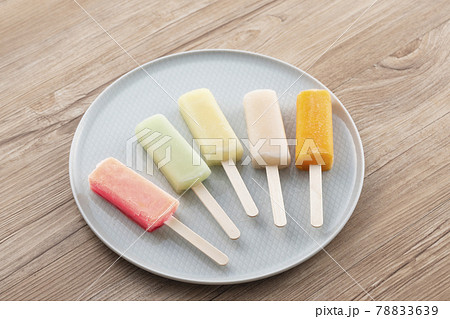 Fruit ice on wooden stick. Lemon popsicle patch