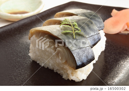 スライスした鯖棒寿司。酢と塩で〆た鯖を酢飯と重ねて作る保存食。