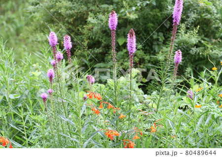 紫色のリアトリスの花が咲いています。学名はLiatris spicataです。