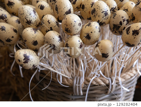 Spotted quail eggs are arranged beautifully on delicate sticks, providing a lovely Easter decoration.