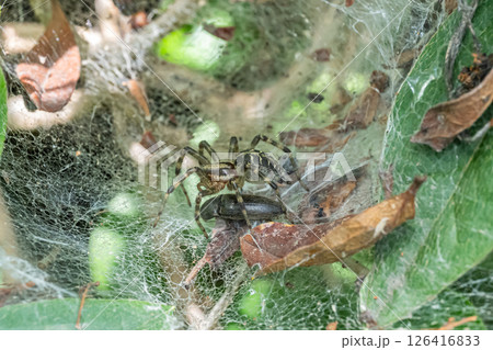 巣の中で昆虫を捕食するコクサグモ