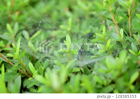 水滴の付いた巣で獲物を待つコクサグモ
