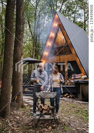 Couple grilling skewers together, enjoying barbecue in forest setting with firewood and nature