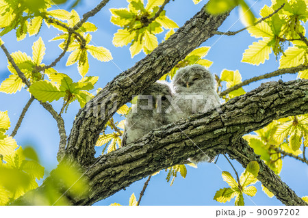 青空を背景に二羽で肩を寄せ合う仲良しの兄弟エゾフクロウの雛