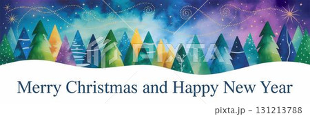 水彩のカラフルなクリスマスツリーと夜空のバナー