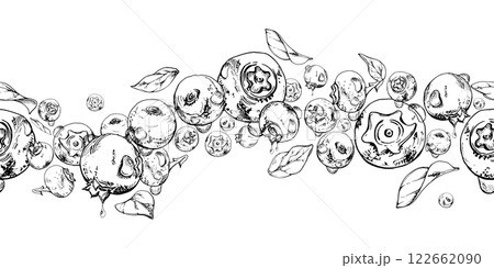Seamless hand drawn blueberry pattern. Repeating doodled blueberries background. Sketched berries wallpaper design for fabric, textile print, wrapping paper. Vector repeated bilberry dessert pattern
