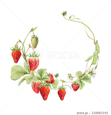 Strawberry on stems with vines tendrils flowers wreath, ripe garden berry pineberry strasberry. Isolated hand drawn watercolor vignette crown frame. Farmers market, eco gardening, food packaging cards