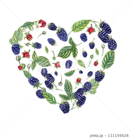 Fresh juicy berries laid out in the shape of heart. Blackberries, leaves. Ripe and unripe berries. Red and black Dewberry. Watercolor illustration. Top view. For cards, package design
