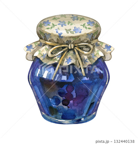 Home made blueberry jam illustration. Watercolor jam jar design isolated on a white background. Forrest berries sweets. Handmade rustic jam.