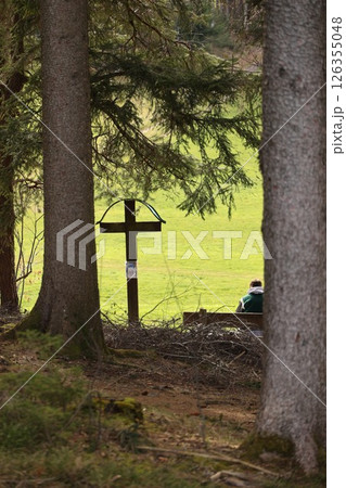 A man sits on a bench in a forest, looking at a cross