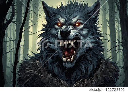 Menacing werewolf silhouette against full moon in misty forest. Dark fantasy creature with glowing red eyes and massive muscular form creates haunting horror atmosphere amid pine trees