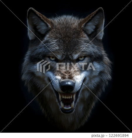 黒背景に浮かぶ威嚇する狼の顔「AI生成画像」