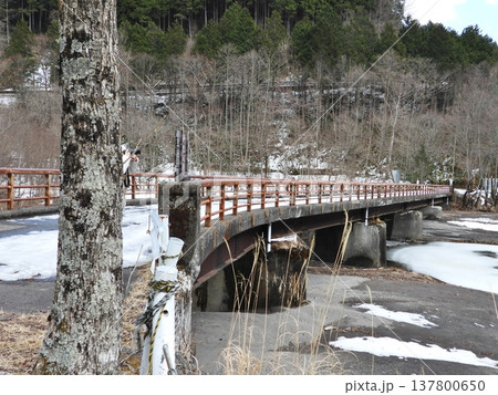 王滝自然湖の県道とカヌーハウスを結ぶ通路の雪景色