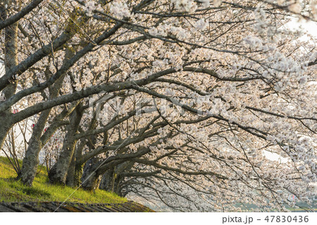 快晴の北海道森町濁川地熱発電所の敷地内で満開のソメイヨシノの風景を撮影