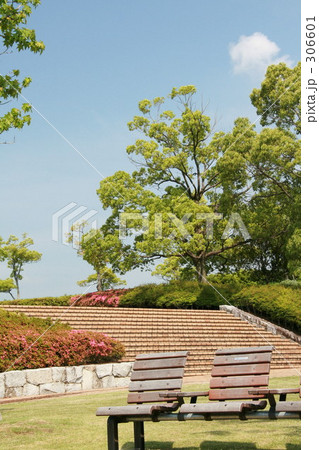 初夏の公園のベンチ