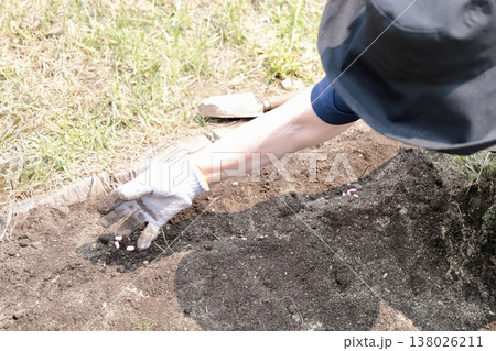 家庭菜園でインゲンの種を植える70歳代女性の手元
