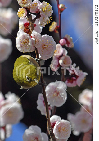 満開の白梅にメジロさん (春イメージ)( ほのぼのイメージ )