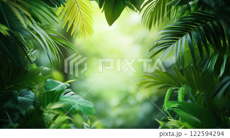 Lush green tropical jungle with sunlight filtering through dense canopy of exotic plants and vibrant foliage