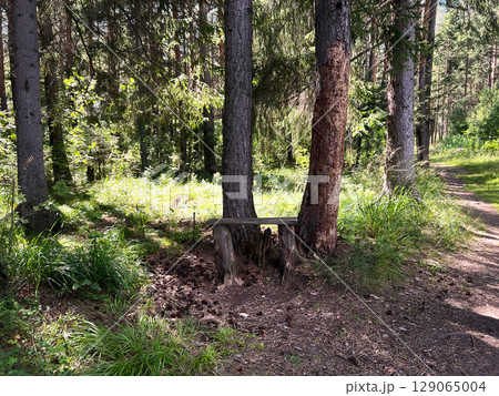 Rustic wooden bench nestled between tall trees in a serene forest, surrounded by lush greenery and dappled sunlight, inviting relaxation and connection with nature