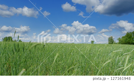 A Beautiful and Vibrant Green Field Situated Beneath a Clear Blue Sky with Fluffy White Clouds