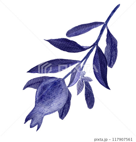 A monochrome pomegranate branch in shades of future dusk pantone color. Hand painted watercolor ideal for sophisticated designs, food blogs, cookbooks, artistic decor, textile, stationary products