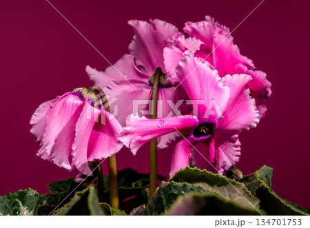 Pink Cyclamen Persicum Plant With Variegated Leaves On Magenta Background
