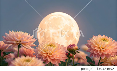 Blooming flowers with a large moon illuminating the night sky in a serene landscape