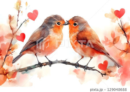 A romantic watercolor illustration depicting two orange birds on a branch surrounded by red hearts