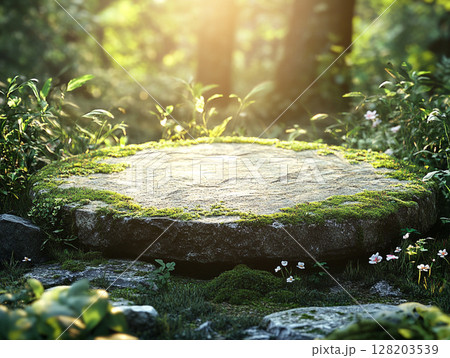A sun-dappled mossy stone podium in a lush forest, surrounded by small white and pink flowers, evoking a magical, serene atmosphere.