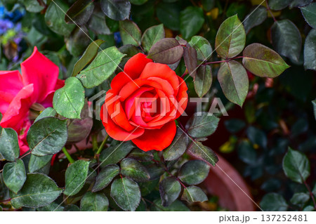 Roses in the garden with sunlight. Roses with green leaves in rural. Flower and plant.