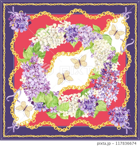 Watercolor pattern for silk scarf and textile print. Design of neckerchief or bandana. Spring flowers lilac, butterflies and golden juvenile chains. Baroque style for textile, wallpaper, covers.
