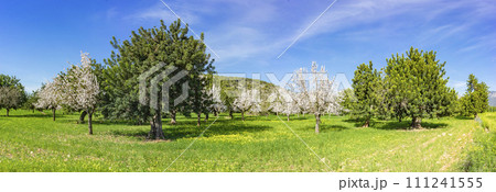 Verdant Springtime Splendor: Blossoming Almond Trees in Panoramic Orchard
